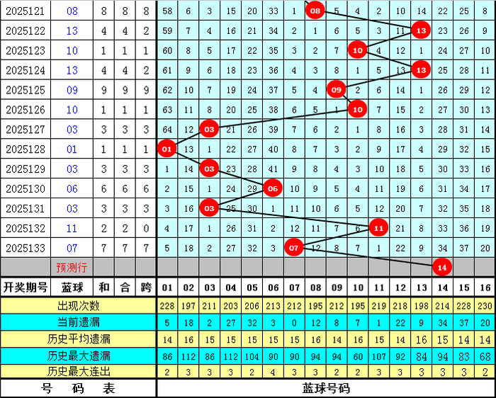 蓝球分析:上期蓝球开出07,为质数号码,本期注意合数蓝球出现,参考蓝球号码14。
