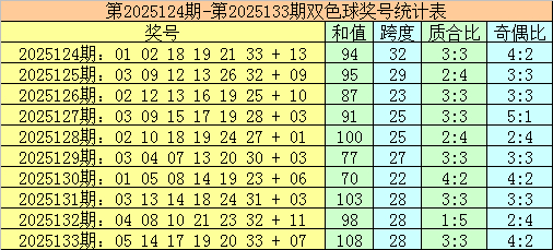 上期回顾:福彩双色球第2025133期开出奖号:05 14 17 19 20 33 + 07,红球三区比1:4:1,奇偶比为4:2。